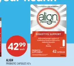 On this page you can compare the current prices of Align probiotic at different retailers such as Shoppers Drug Mart. Whether you are looking for ALIGN PROBIOTIC CAPSULES, ALIGN Probiotic Capsules (42) & ALIGN, Probiotic supplement, 28 capsules, you will immediately see where you can buy the product for the lowest price. The cheapest deal is automatically listed at the top, including retailer name, price, and validity period.