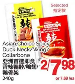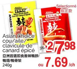 | ASIAN CHOICE COU/AILE/CLAVICULE DE CANARD ÉPICÉ, 240g | T&T Supermarket | $5.49 | 26 January 2024 | 01 February 2024 | |||