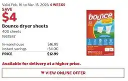| 1 | Bounce dryer sheets | Costco | $16.99 | $12.99 | Save $4 | 16 February 2026 | 01 March 2026 | View offer | |