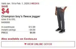 1Costco Champion boy's fleece jogger offerChampion boy's fleece joggerCostco$13.99$9.99Save $419 January 202601 February 2026 View offer