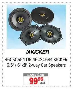 This week there are several deals for Car speakers available, such as at 2001 Audio Video and other major chains. You will find offers like buy 1 get 1 free and Save up to 25$ or sharp discount prices on 46CSC654 OR 46CSC684 KICKER 6.5 8 6x8 2-way Car Speakers, FRE Non-Alcoholic Cabernet Sauvignon & Kiri Cream Cheese. With the filters you can easily select by packaging type, quantity, or your preferred retailer.