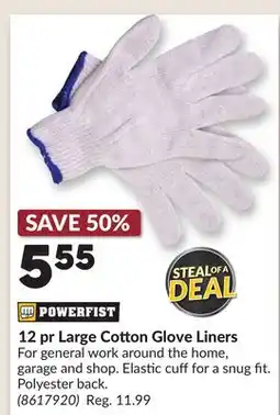| 12 pr Large Cotton Glove Liners | Princess Auto | $12.07 | $5.55 | $6.52 Discount | 27 January 2026 | 08 February 2026 | |