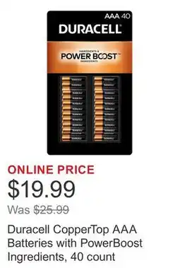 | Duracell CopperTop AAA Batteries with PowerBoost Ingredients, 40 count | Costco | $19.99 | 22 December 2025 | 28 December 2025 | |||