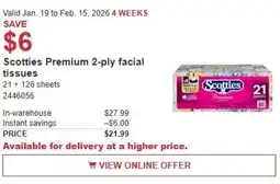 1Costco Scotties Premium 2-ply facial tissues offerScotties Premium 2-ply facial tissuesCostco$27.99$21.99Save $619 January 202601 February 2026 View offer