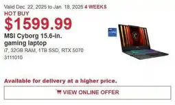4Costco MSI Cyborg 15.6-in. gaming laptop offerMSI Cyborg 15.6-in. gaming laptopCostco$1,599.9922 December 202518 January 2026 View offer