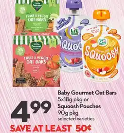 | Baby Gourmet Oat Bars 5x18g pkg or Squoosh Pouches 90g pkg | Longo's | $4.99 | -9% | 08 January 2026 | 14 January 2026 | ||