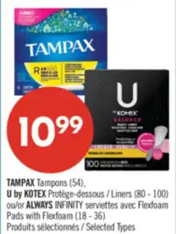 Pharmaprix TAMPAX Tampons (54), U by KOTEX Liners (80 - 100) ou ALWAYS INFINITY Pads with Flexfoam (18 - 36) offer