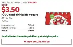 2Costco IÖGO nanö drinkable yogurt offerIÖGO nanö drinkable yogurtCostco$13.49$9.99$3.50 Discount16 February 202601 March 2026 View offer