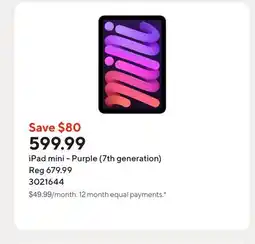 1Staples iPad mini - Purple (7th generation) offeriPad mini - Purple (7th generation)Staples$681.81$599.99$81.82 Discount30 January 202612 February 2026 View offer