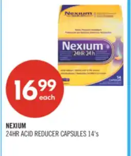 This week there are several deals for Nexium available, such as at Shoppers Drug Mart and other major chains. You will find offers like buy 1 get 1 free and Save up to 25$ or sharp discount prices on NEXIUM 24HR ACID REDUCER CAPSULES, NEXIUM 24HR Heartburn Relief Capsules 14' s & Meiomi. With the filters you can easily select by packaging type, quantity, or your preferred retailer.