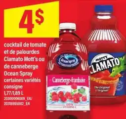 Maxi COCKTAIL DE TOMATE ET DE PALOURDES CLAMATO MOTT'S OU DE CANNEBERGE OCEAN SPRAY, 1,77/1 offer