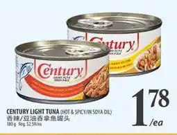 Al Premium Food Mart CENTURY LIGHT TUNA (HOT & SPICY/IN SOYA OIL) offerCENTURY LIGHT TUNA (HOT & SPICY/IN SOYA OIL)Al Premium Food Mart$2.58$1.78$0.80 Discount26 February 202604 March 2026