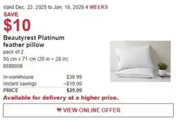 2Costco Beautyrest Platinum feather pillow offerBeautyrest Platinum feather pillowCostco$39.99$29.99Save $1022 December 202518 January 2026 View offer