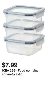 | Ikea 365+ food container, square/plastic, 25 oz (750 ml) | IKEA | $6.99 | 16 February 2023 | 23 February 2023 | |||