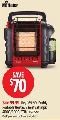 This week there are several deals for Portable heater available, such as at Canadian Tire and other major chains. You will find offers like buy 1 get 1 free and Save up to 25$ or sharp discount prices on Mr. Heater Portable Heater, Mr. Heater Buddy Portable Heater & Buddy Portable Heater. With the filters you can easily select by packaging type, quantity, or your preferred retailer.