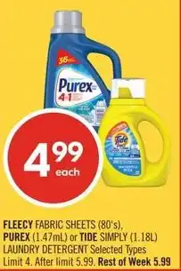 Pharmaprix FLEECY Fabric Sheets (80), PUREX (1,47 mL) or TIDE SIMPLY (1,18 L) Laundry Detergent offerFLEECY Fabric Sheets (80), PUREX (1,47 mL) or TIDE SIMPLY (1,18 L) Laundry DetergentPharmaprix$4.9903 January 202604 January 2026