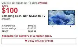 | 1 | Samsung Q8F QLED 4K TV 65 in | Costco | $996.99 | $896.99 | Save $100 | 22 December 2025 | 05 January 2026 | View offer | |
