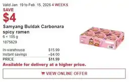1Costco Samyang Buldak Carbonara spicy ramen offerSamyang Buldak Carbonara spicy ramenCostco$15.99$11.99Save $419 January 202601 February 2026 View offer