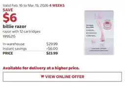| billie razor razor with 12 cartridges | Costco | $29.99 | $23.99 | $6.00 Discount | 16 February 2026 | 15 March 2026 | |