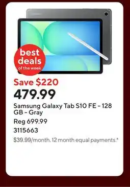 This week there are several deals for Samsung Galaxy S10 available, such as at Staples and other major chains. You will find offers like buy 1 get 1 free and Save up to 25$ or sharp discount prices on Samsung Galaxy Tab S10 FE - 128 GB - Gray, Samsung Galaxy Tab S10 Lite Tablet - 128 GB - Grey & Felt Hedgehog/Poinsettia Ornament. With the filters you can easily select by packaging type, quantity, or your preferred retailer.