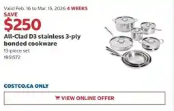 | 2 | All-Clad D3 stainless 3-ply bonded cookware | Costco | Save $250 | 16 February 2026 | 01 March 2026 | View offer | |||