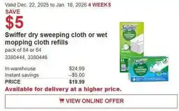 1Costco Swiffer dry sweeping cloth or wet mopping cloth refills offerSwiffer dry sweeping cloth or wet mopping cloth refillsCostco$24.99$19.99Save $522 December 202505 January 2026 View offer