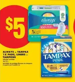 | ALWAYS or TAMPAX 1X, PADS, LINERS or TAMPONS, 10-72' s | No Frills | $5.00 | 02 October 2025 | 08 October 2025 | |||