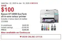 | 1 | Epson ET-3958 Eco Tank all-in-one colour printer | Costco | $449.99 | $349.99 | Save $100 | 22 December 2025 | 18 January 2026 | View offer | |