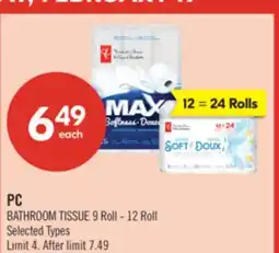 1Shoppers Drug Mart PC BATHROOM TISSUE 9 Roll - 12 Roll offerPC BATHROOM TISSUE 9 Roll - 12 RollShoppers Drug Mart$6.4914 February 202619 February 2026 View offer
