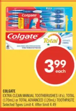 COLGATE EXTRA CLEAN MANUAL TOOTHBRUSHES (4's), TOTAL (170mL) or TOTAL ADVANCED (120mL) TOOTHPASTE