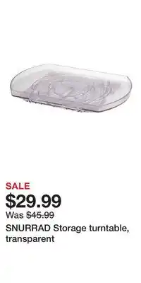 2IKEA SNURRAD Storage turntable, transparent offerSNURRAD Storage turntable, transparentIKEA$46.14$29.99$16.15 Discount29 January 202604 February 2026 View offer