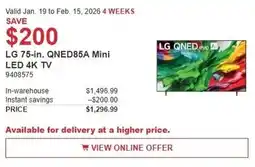 | 2 | LG 75-in. QNED85A Mini LED 4K TV | Costco | $1,496.99 | $1,296.99 | Save $200 | 19 January 2026 | 01 February 2026 | View offer | |