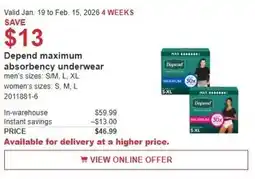 | Depend maximum absorbency underwear | Costco | $59.99 | $46.99 | Save $13 | 19 January 2026 | 01 February 2026 | |