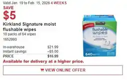 1Costco Kirkland Signature moist flushable wipes offerKirkland Signature moist flushable wipesCostco$21.99$16.99Save $519 January 202601 February 2026 View offer