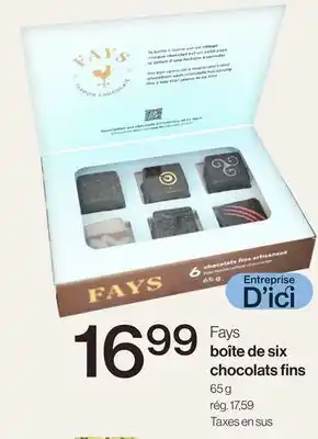 This promotion is available in various stores, view all products to get the cheapest Boîte de six chocolats fins. If you'd like to find out whether this product has a bigger discount in another store, check the category 'Grocery'. You may also find these offers interesting: Six Cheese Tortellini, FINS CHOCOLATS À LA NOISETTE COLLECTION | FINE HAZELNUT CHOCOLATES, 156/200 G & DMDQ BOÎTE -CADEAU DE THÉ QUAL SUP.