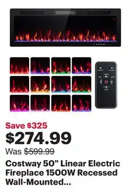 The Costway 50 Linear Electric Fireplace 1500W Recessed Wall-Mounted with Multi-Color Flame is available this week at Best Buy with a valuable discount. On this page, you will find details about the current promotional price, the promotion terms, and any special discounts. You can also explore other related deals and promotions for Costway 50 Linear Electric Fireplace 1500W Recessed Wall-Mounted with Multi-Color Flame to make sure you get the best value.