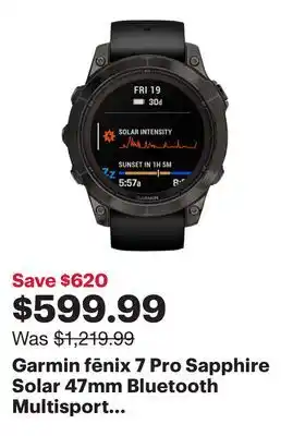 The Garmin fēnix 7 Pro Sapphire Solar 47mm Bluetooth Multisport Smartwatch - Carbon Grey/Black is available this week at Best Buy with a valuable discount. On this page, you will find details about the current promotional price, the promotion terms, and any special discounts. You can also explore other related deals and promotions for Garmin fēnix 7 Pro Sapphire Solar 47mm Bluetooth Multisport Smartwatch - Carbon Grey/Black to make sure you get the best value.