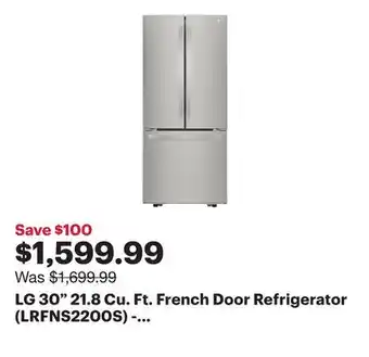 The price of LG 30 21.8 Cu. Ft. French Door Refrigerator (LRFNS2200S) - Stainless Steel can be found at the top of the page, together with the dates during which the offer is available. You can also check the price in the current Best Buy flyer or on the Best Buy website. Promotional offers assure you of buying Best Buy products at the lowest price.