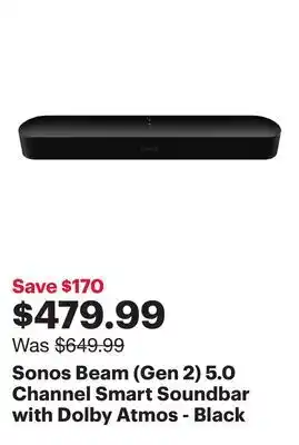 Now on sale at Best Buy: Sonos Beam (Gen 2) 5.0 Channel Smart Soundbar with Dolby Atmos - Black ✅ Valid from 6-02 to 12-02.