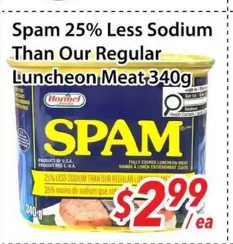 This Spam 25% Less Sodium Than Our Regular Luncheon Meat is now on sale at Bestco Food Mart. Check the current selection filled with great deals and discounts. Purchase Spam 25% Less Sodium Than Our Regular Luncheon Meat online via Bestco Food Mart website or get it at the best available price in person. Flyerdeals.ca gathers the best Spam 25% Less Sodium Than Our Regular Luncheon Meat promotions for you. Click on the bell icon to receive a free notification when this product is on sale again.Spam 25% Less Sodium Than Our Regular Luncheon Meat promotions for next week