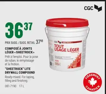 BMR offers a wide collection of products, besides the COMPOSÉ À JOINTS LÉGER SHEETROCK . Keep an eye on the weekly BMR flyer to find the best offers and promotions. Besides COMPOSÉ À JOINTS LÉGER SHEETROCK , you can also find the following offers: LEGER SIGNATURE, LEGER SIGNATURE 2-PIECE Set & CGC Sheetrock Total Drywall Compound •.