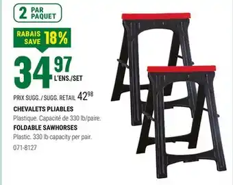 This promotion is available in various stores, view all products to get the cheapest FOLDABLE SAWHORSES. If you'd like to find out whether this product has a bigger discount in another store, check the category 'DIY'. You may also find these offers interesting: Certified Sawhorses, 2 pk 770 lb Sawhorses & Certified Sawhorses, 2-Pk.