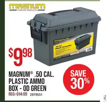 This promotion is available in various stores, view all products to get the cheapest MAGNUM .50 CAL. PLASTIC AMMO BOX - OD GREEN. If you'd like to find out whether this product has a bigger discount in another store, check the category 'Sports'. You may also find these offers interesting: MAGNUM GREEN MINI AMMO STORAGE BOX, 50-Cal. Steel Ammo Box & 4 pc .30-Cal. Ammo Box Set with Crate.