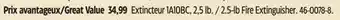 This promotion is available in various stores, view all products to get the cheapest 2.5-lb Fire Extinguisher. If you'd like to find out whether this product has a bigger discount in another store, check the category 'DIY'. You may also find these offers interesting: 2.5 lb Kitchen/Garage Fire Extinguisher 10-B:C, Garrison General Purpose Fire Extinguisher, 1A5BC/2-lb & Home/Office Fire Extinguisher 3A40BC.