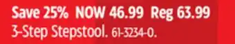 The price of 3-Step Stepstool can be found at the top of the page, together with the dates during which the offer is available. You can also check the price in the current Canadian Tire flyer or on the Canadian Tire website. Promotional offers assure you of buying Canadian Tire products at the lowest price.