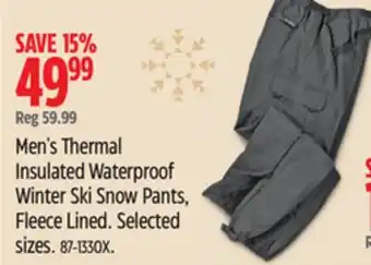 The price of Men's Thermal Insulated Waterproof Winter Ski Snow Pants, Fleece Lined can be found at the top of the page, together with the dates during which the offer is available. You can also check the price in the current Canadian Tire flyer or on the Canadian Tire website. Promotional offers assure you of buying Canadian Tire products at the lowest price.