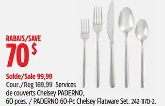 This PADERNO 60-Pc Chelsey Flatware Set is now on sale at Canadian Tire. Check the current selection filled with great deals and discounts. Purchase PADERNO 60-Pc Chelsey Flatware Set online via Canadian Tire website or get it at the best available price in person. Flyerdeals.ca gathers the best PADERNO 60-Pc Chelsey Flatware Set promotions for you. Click on the bell icon to receive a free notification when this product is on sale again.PADERNO 60-Pc Chelsey Flatware Set promotions for next week
