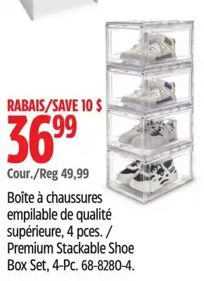 The Premium Stackable Shoe Box Set is available this week at Canadian Tire with a valuable discount. On this page, you will find details about the current promotional price, the promotion terms, and any special discounts. You can also explore other related deals and promotions for Premium Stackable Shoe Box Set to make sure you get the best value.