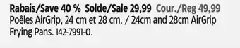The price of T-fal 24cm and 28cm AirGrip Frying Pans can be found at the top of the page, together with the dates during which the offer is available. You can also check the price in the current Canadian Tire flyer or on the Canadian Tire website. Promotional offers assure you of buying Canadian Tire products at the lowest price.