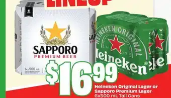 Heineken Original Lager or Sapporo Premium Lager 6x500 mL Tall Cans offers and online promotions